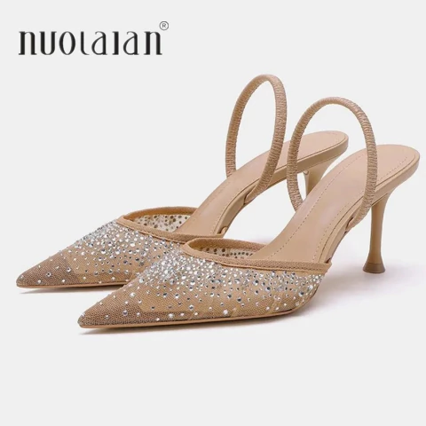 Novas Sandálias Femininas de Verão com Salto Alto Elegante em Strass e Malha Brilhante - Slingback Bico Fino Slip-On para Festa