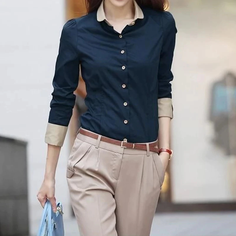 Nova Blusa Elegante Feminina de Primavera com Retalhos em Contraste, Manga Longa, Gola Polo Slim e Versátil